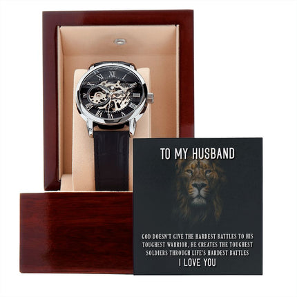 Give the gift of luxury with this handsome and daring timepiece. The Men's Openwork Watch is the perfect blend of classic design and modern styling, making it an essential accessory for your remarkable style. This watch sports a genuine leather strap, is splash resistant, and has increased durability thanks to hardened mineral glass. Our unique skeleton dial feature allows you to peer directly into the inner workings of your watch. Beautifully crafted to be automatic, this watch requires motion instead of batteries. You will keep precise time simply by wearing it, no winding necessary. This magnificent piece makes the perfect gift for yourself or any man in your life looking to add a tasteful element into his wardrobe.
